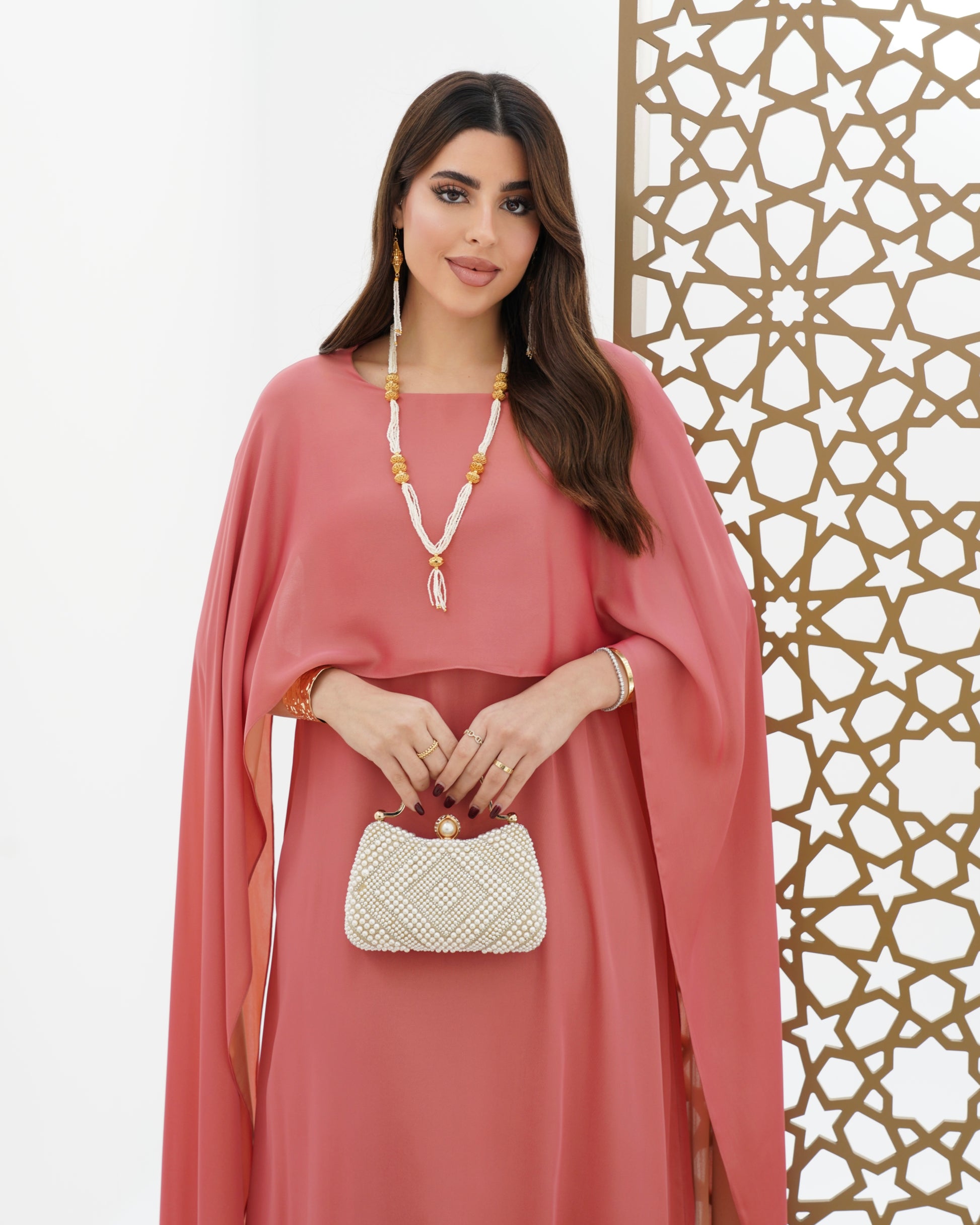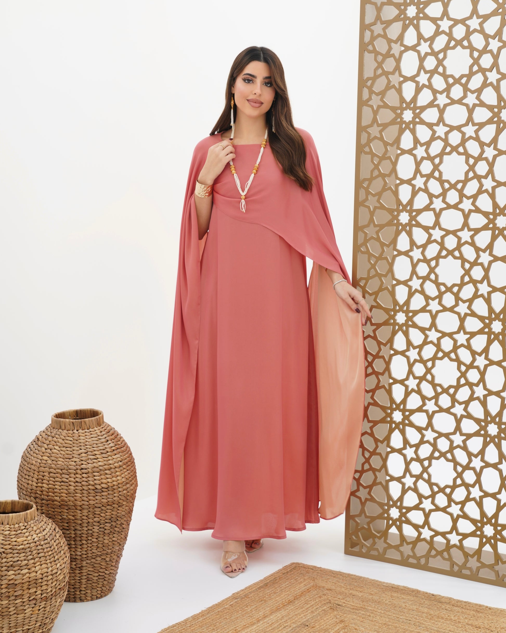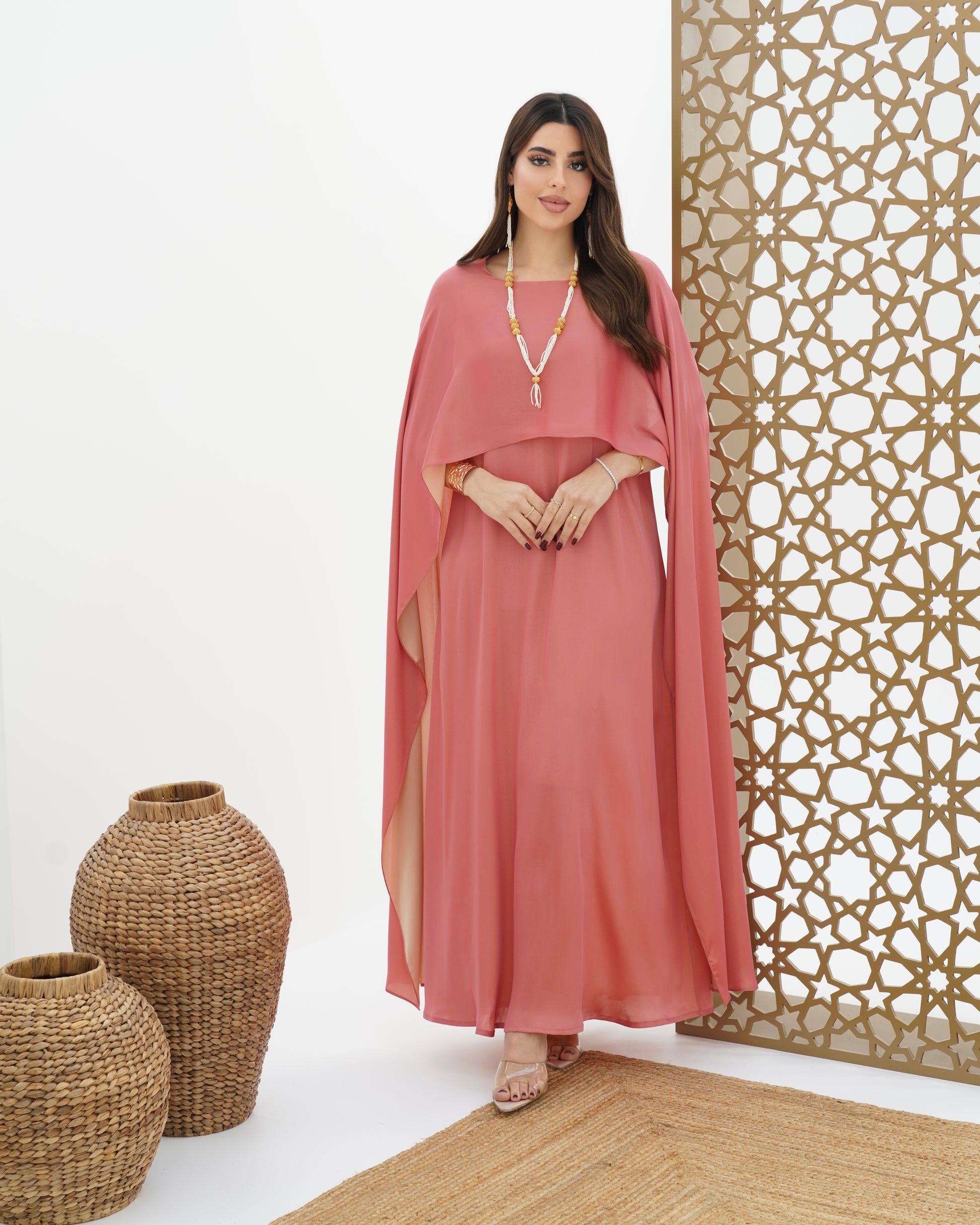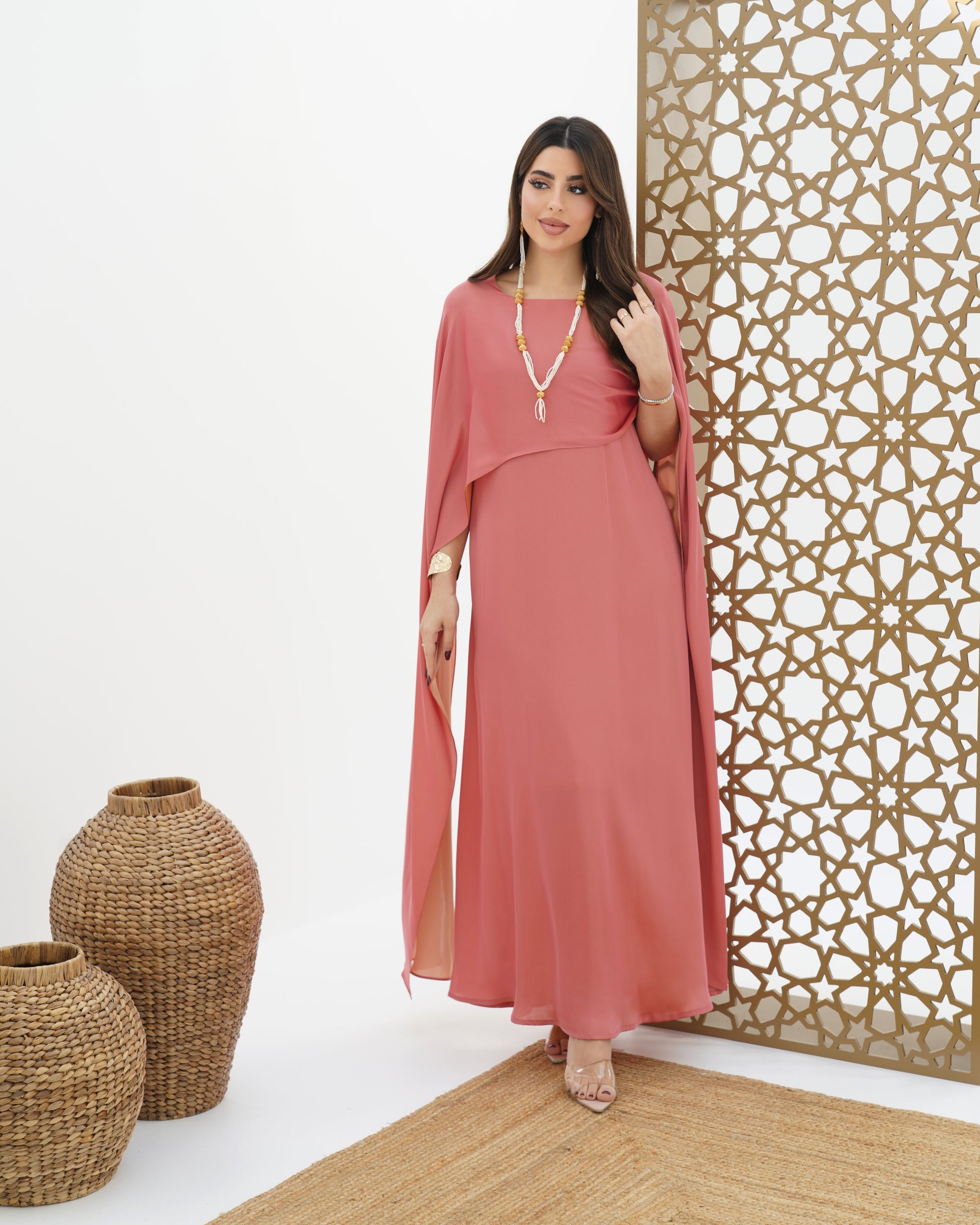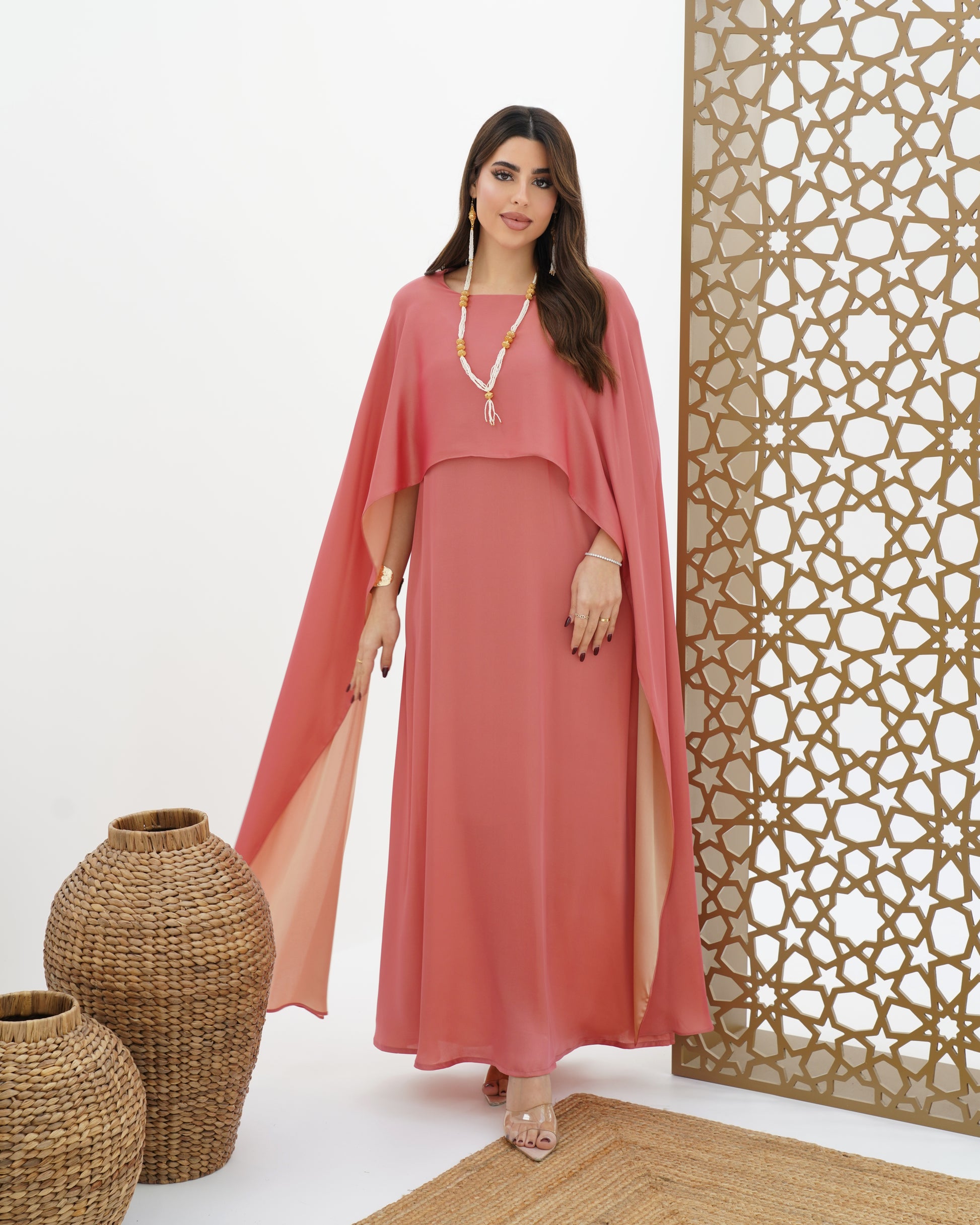 Dress with double-sided stitched shawl
